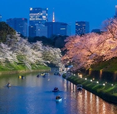 A serene moat walk beside the Imperial Palace with cherry trees reflected in the water — beautiful by day or lit up at night.