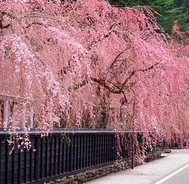 Historic samurai streets are lined with elegant weeping cherry trees, creating a dreamy traditional backdrop.